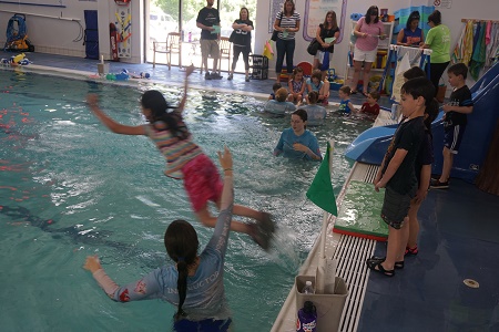 One of the children’s favorite activity is jumping in the pool fully clothed. Being in the water fully clothed is much different than when wearing swimsuits so practicing this provides kids with the opportunity to see how this feels and to learn that they can swim and make their way to safety – even of they aren’t in their typical swim attire! And it’s fun for the kids since they’re never allowed to jump in fully clothed otherwise!